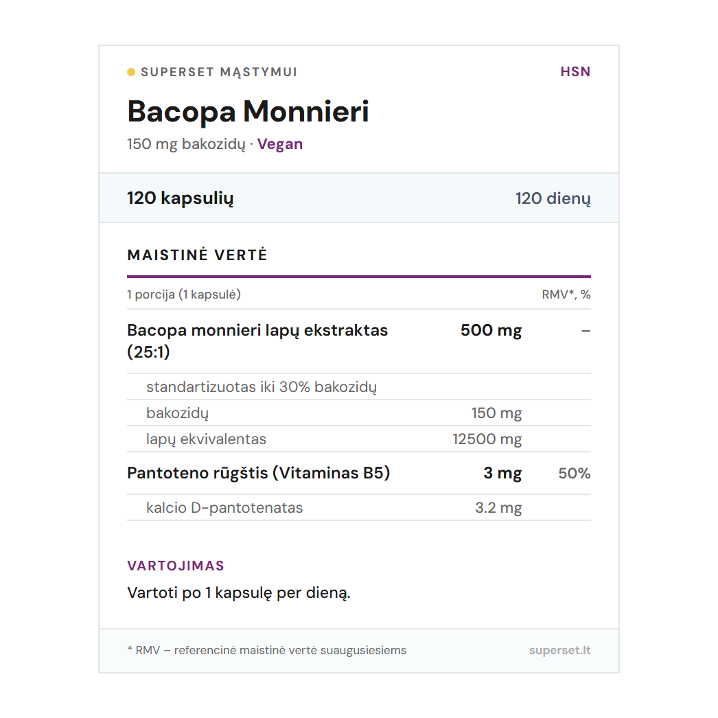 | Bacopa monnieri lapų ekstraktas (25:1) (30% bakozidų) | 500mg | - |