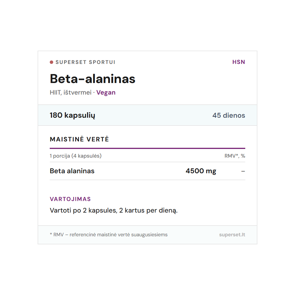 Beta-alaninas – karnozino pirmtakas, dažniausiai pasirenkamas didelio intensyvumo treniruotėms. Veikia per kaupimąsi, ne kaip stimuliantas.