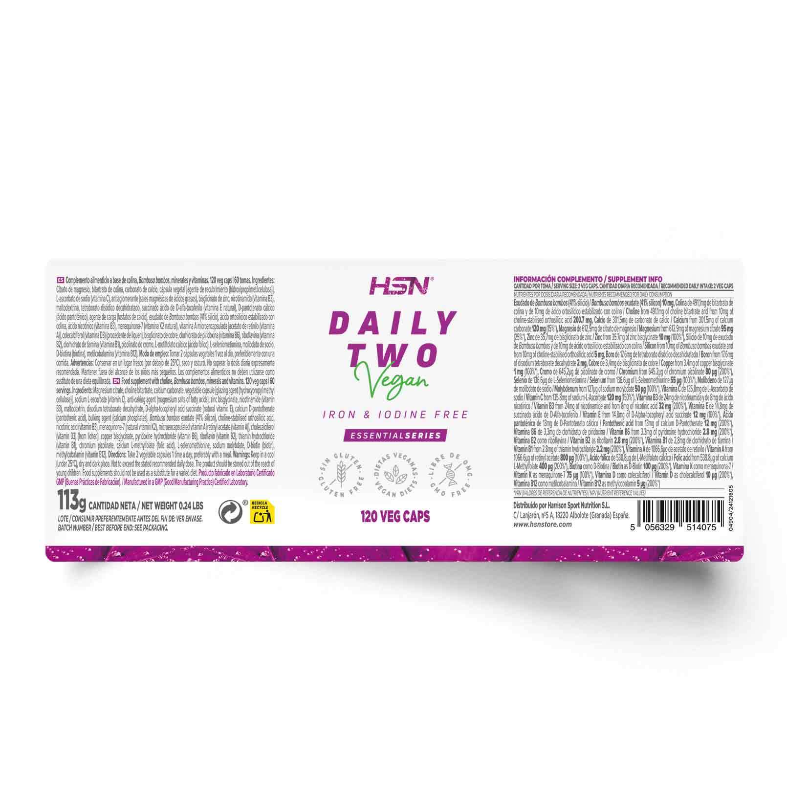 Multivitaminai „Daily Two” – tai lanksčios dozės papildas, praturtintas svarbiausiais vitaminais ir mineralais, sukurtas tiems, kuriems nereikia papildomos geležies ar jodo. Jame yra visi 12 vitaminų (A, B grupės, C, D, E, K) ir net 10 mineralų (įskaitant cinką, seleną, chromą, magnį ir kt.) biologiškai prieinamomis formomis. „Daily Two” išskirtinumas – lanksti dozuotė (1-2 kapsulės per dieną pagal individualius poreikius), 100% veganiškas sudėtis ir papildomi mikroelementai: cholinas, silicis ir boras. Šis papildas be geležies ir jodo, todėl idealiai tinka suaugusiems vyrams, moterims po menopauzės, ir visiems, kuriems pakanka geležies ir jodo su maistu arba kurie vengia šių mikroelementų dėl sveikatos priežasčių.