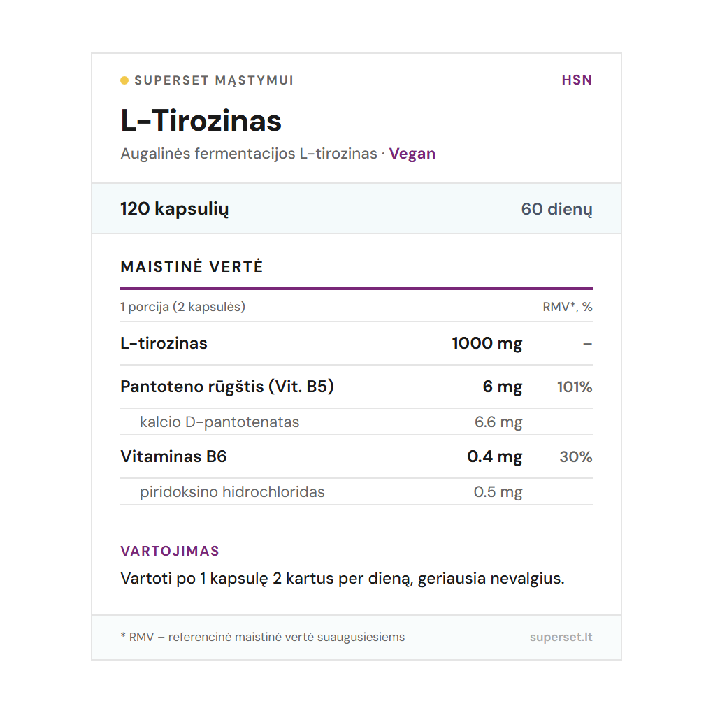 HSN L-tirozinas 500 mg papildytas vitaminais B5 (pantoteno rūgštis) ir B6, kurie veikia sinergiškai su L-tirozinu, stiprindami jo poveikį pažinimo funkcijai. Pantoteno rūgštis dalyvauja neuromediatorių sintezėje ir apykaitoje, o vitaminas B6 padeda mažinti pavargimo jausmą ir nuovargį bei palaikyti normalią nervų sistemos veiklą.