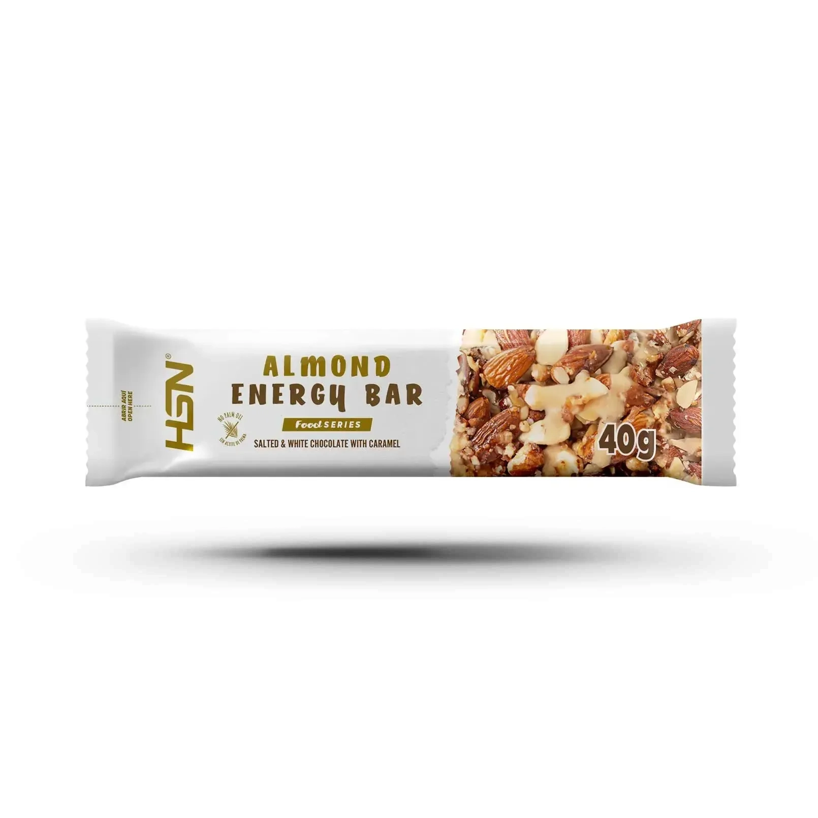 Migdolų batonėlis su karamele – 55% skrudintų migdolų, baltas šokoladas su sūria karamele, medus ir jūros druska. Desertas, kurį valgai be kaltės jausmo.