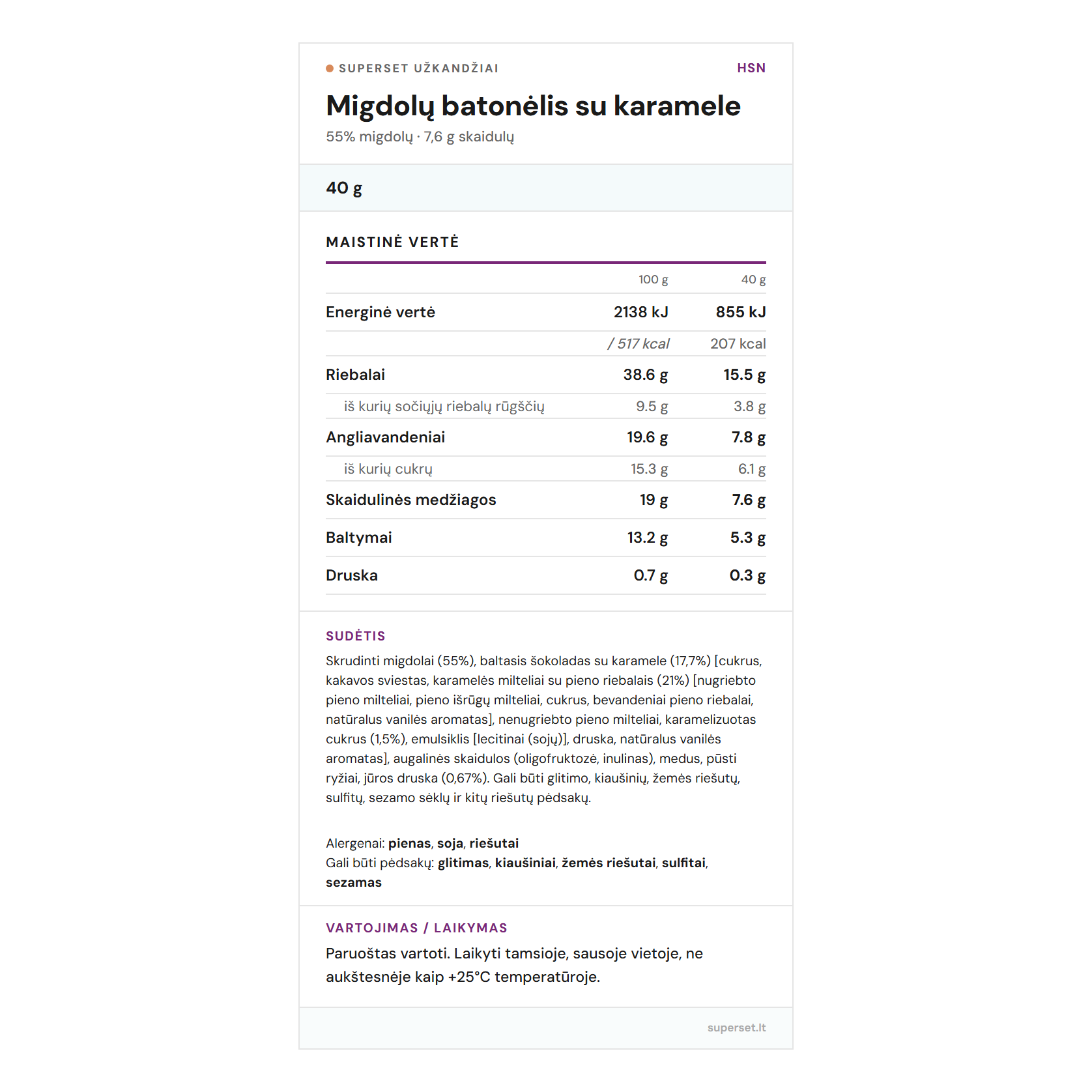 | Maistingumas | 100 g | 40 g (vienoje porcijoje) |