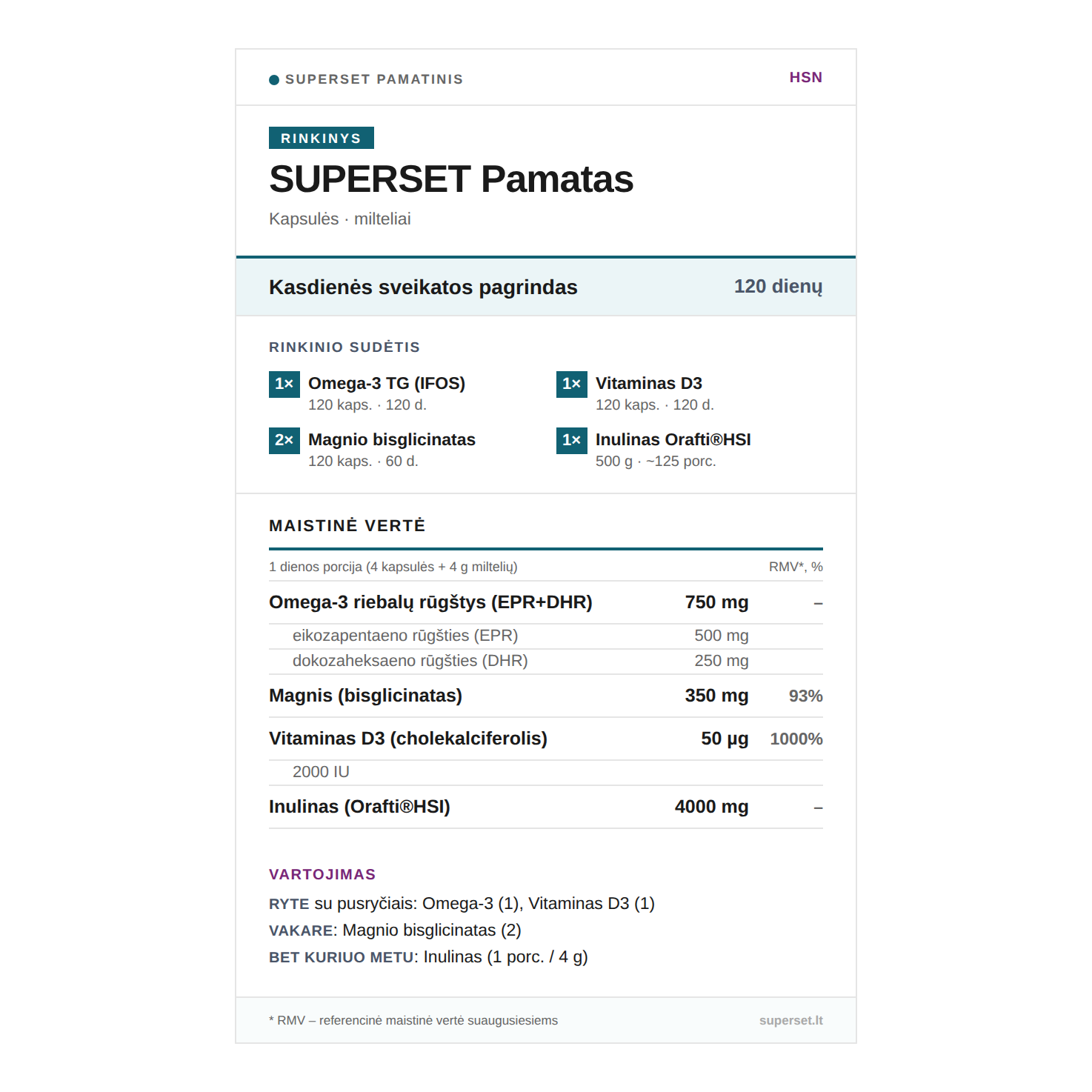 - Vitaminas D3 – 2000 IU (50 µg): padeda palaikyti normalią imuninės sistemos veiklą, kaulų būklę ir raumenų funkciją.
