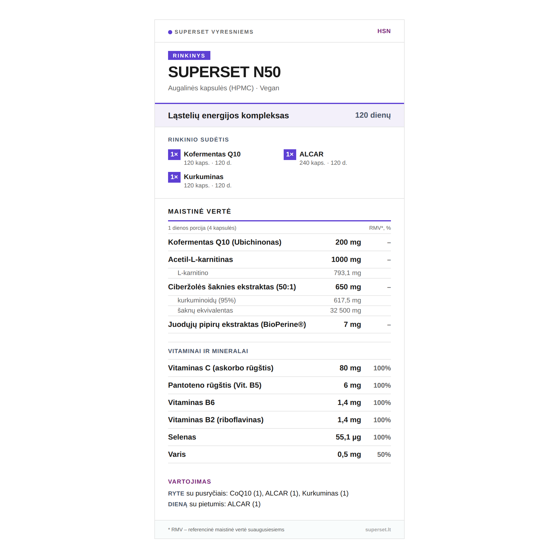 SUPERSET N50 – ląstelių energijos kompleksas senstantiems procesams palaikyti: Kofermentas Q10 (CoQ10), ALCAR, Kurkuminas. Trys papildai, kurių poreikis po 50 metų išauga labiausiai – pilnomis klinikinėmis dozėmis.