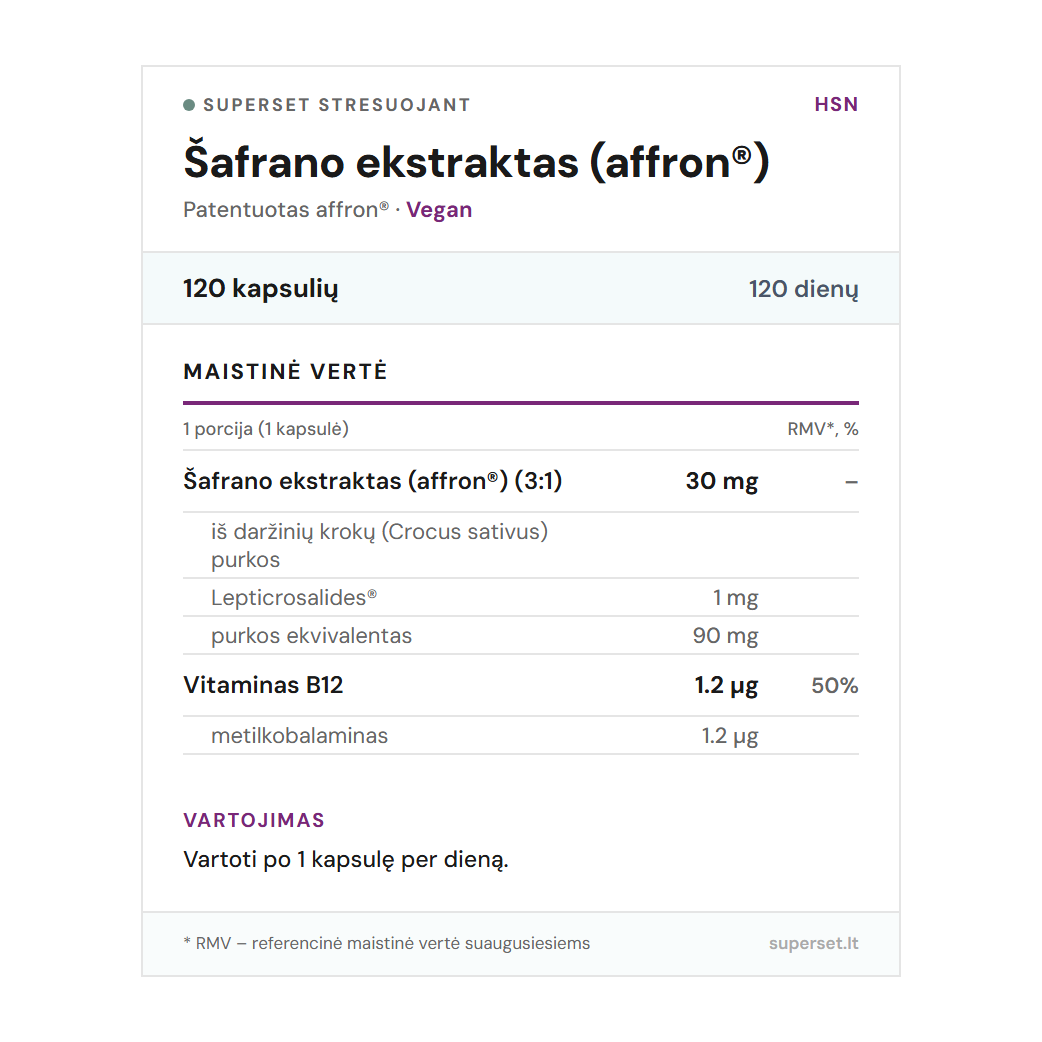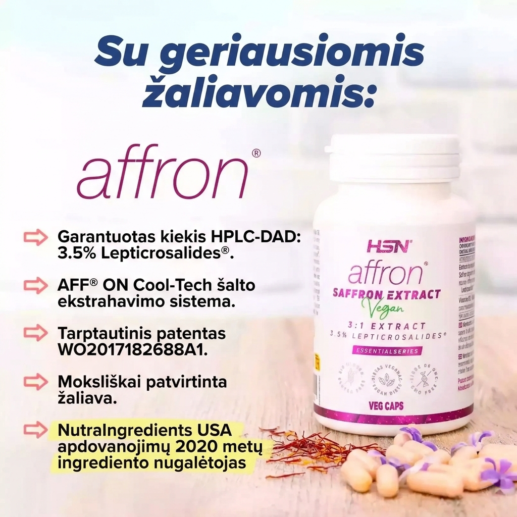 Šiame produkte naudojamas affron® – visame pasaulyje pripažintas, patentuotas šafrano ekstraktas, gaminamas Ispanijoje. Skirtingai nuo paprastų šafrano miltelių, affron® yra standartizuotas iki 3,5% leptikrozalidų®, užtikrinant, kad kiekvienoje kapsulėje gautumėte tikslų ir kliniškai patvirtintą veikliųjų medžiagų kiekį. affron® autentiškumas yra patvirtintas DNR testais, garantuojančiais botaninį grynumą.